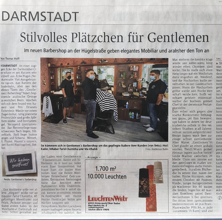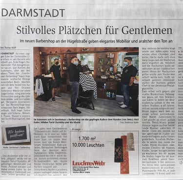Unser erfahrenes Team arbeitet mit Leidenschaft, Sorgfalt und höchsten Ansprüchen an Qualität und Hygiene. Dass unser Konzept überzeugt, bestätigt auch die Berichterstattung der Darmstädter Zeitung, die Gentlemen’s Barber Shop als stilvollen Treffpunkt für Männer würdigt.